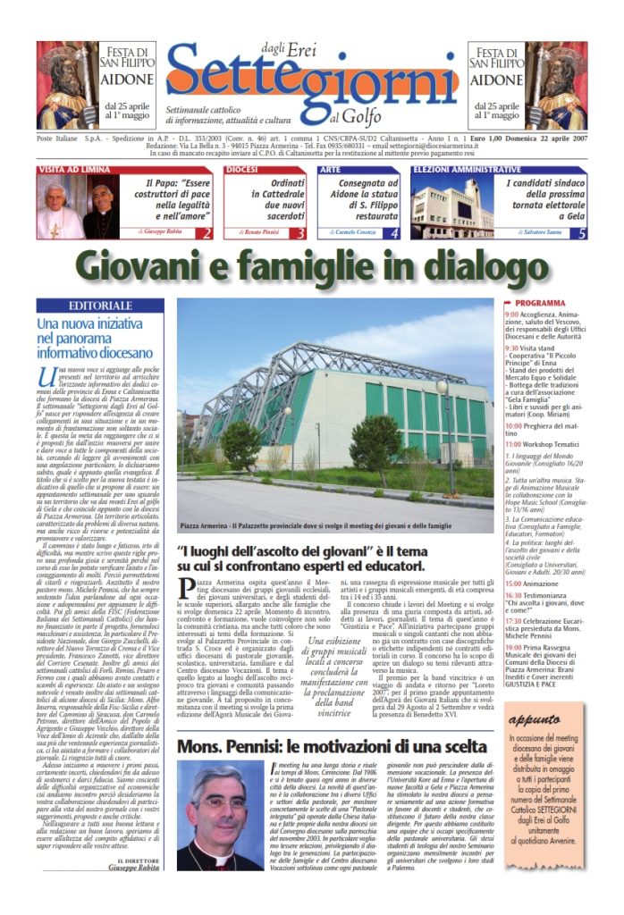 22 Aprile 2007 numeri del settimanale Settegiorni Settegiorni n. 1 del 22 aprile 2007 Clicca qui per leggere il numero in formato pdf CONDIVIDI SU