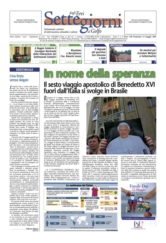 13 Maggio 2007 numeri del settimanale Settegiorni Settegiorni n. 4 del 13 maggio 2007 clicca qui per leggere il numero in formato PDF CONDIVIDI SU