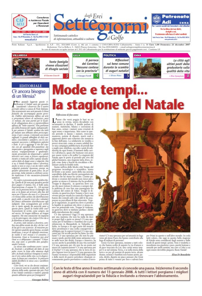 23 Dicembre 2007 numeri del settimanale Settegiorni Settegiorni n. 30 del 23 dicembre 2007 Clicca qui per leggere il numero in formato PDF CONDIVIDI SU