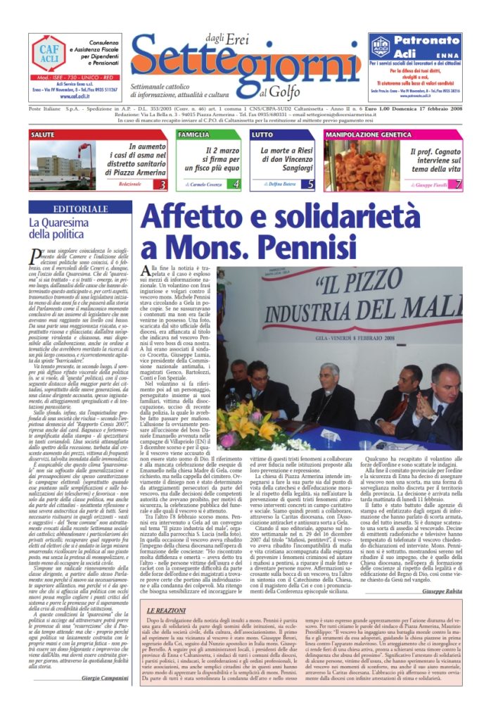 17 Febbraio 2008 numeri del settimanale Settegiorni Settegiorni n. 6 del 17 febbraio 2008 Clicca qui per leggere il numero in formato PDF CONDIVIDI SU
