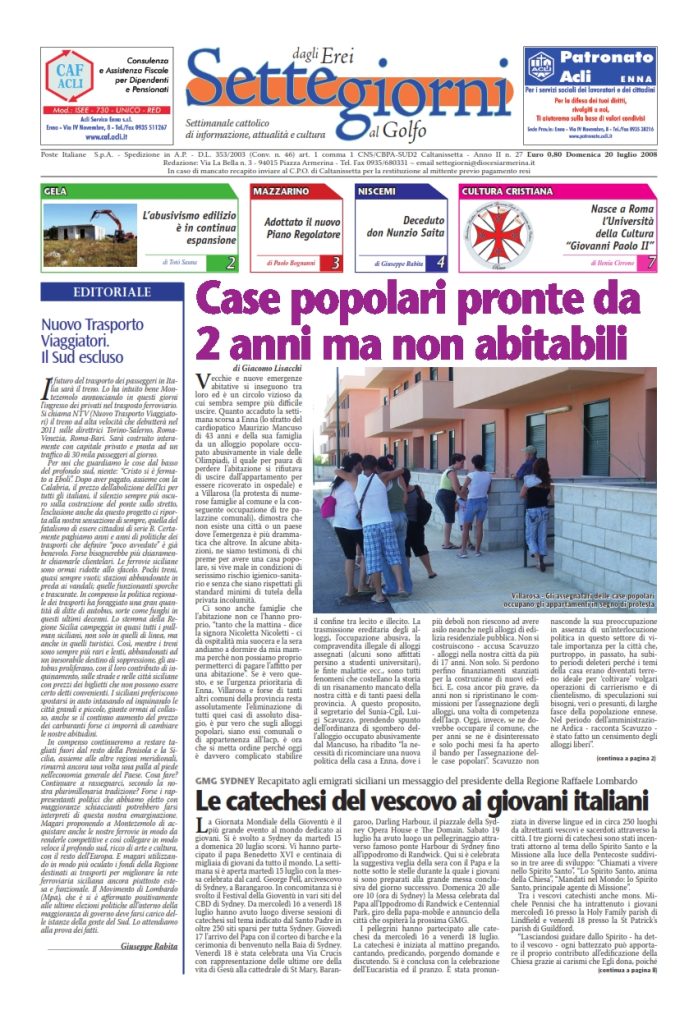 20 Luglio 2008 numeri del settimanale Settegiorni Settegiorni n. 27 del 20 luglio 2008 Clicca qui per leggere il numero in formato PDF CONDIVIDI SU