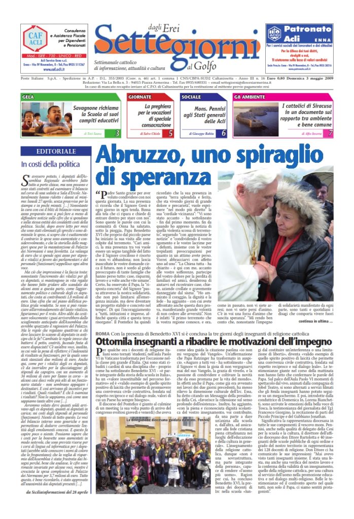 3 Maggio 2009 numeri del settimanale Settegiorni Settegiorni n. 16 del 3 maggio 2009 Clicca qui per leggere il numero in formato PDF CONDIVIDI SU