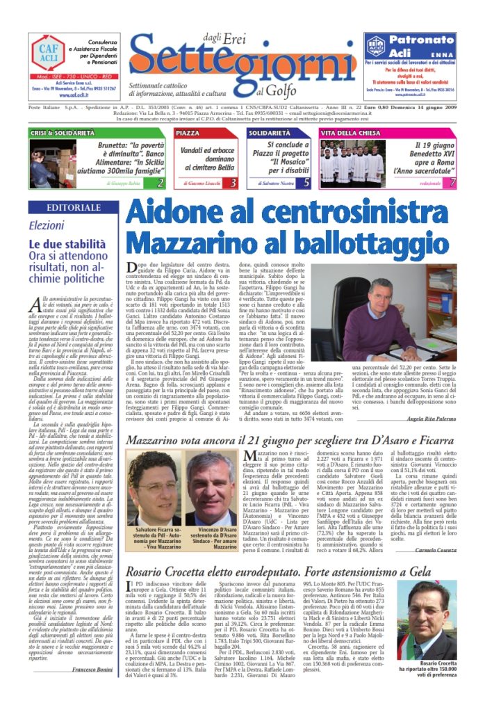 14 Giugno 2009 numeri del settimanale Settegiorni Senza categoria Settegiorni n. 22 del 14 giugno 2009 Clicca qui per leggere il numero in formato PDF CONDIVIDI SU