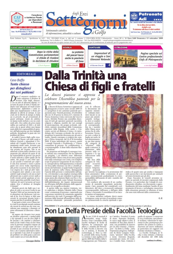 13 Settembre 2009 numeri del settimanale Settegiorni Settegiorni n. 30 del 13 settembre 2009 Clicca qui per leggere il numero in formato PDF CONDIVIDI SU