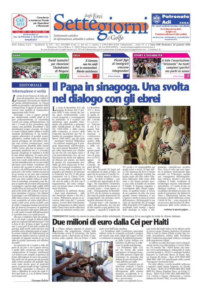 24 Gennaio 2010 numeri del settimanale Settegiorni Settegiorni n. 4 del 24 gennaio 2010 Clicca qui per leggere il numero in formato PDF CONDIVIDI SU