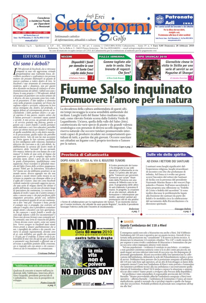 28 Febbraio 2010 numeri del settimanale Settegiorni Settegiorni n. 9 del 28 febbraio 2010 Clicca qui per leggere il numero in formato PDF CONDIVIDI SU