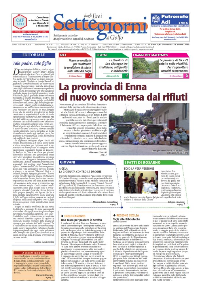 14 Marzo 2010 numeri del settimanale Settegiorni Settegiorni n. 11 del 14 marzo 2010 Clicca qui per leggere il numero in formato PDF CONDIVIDI SU