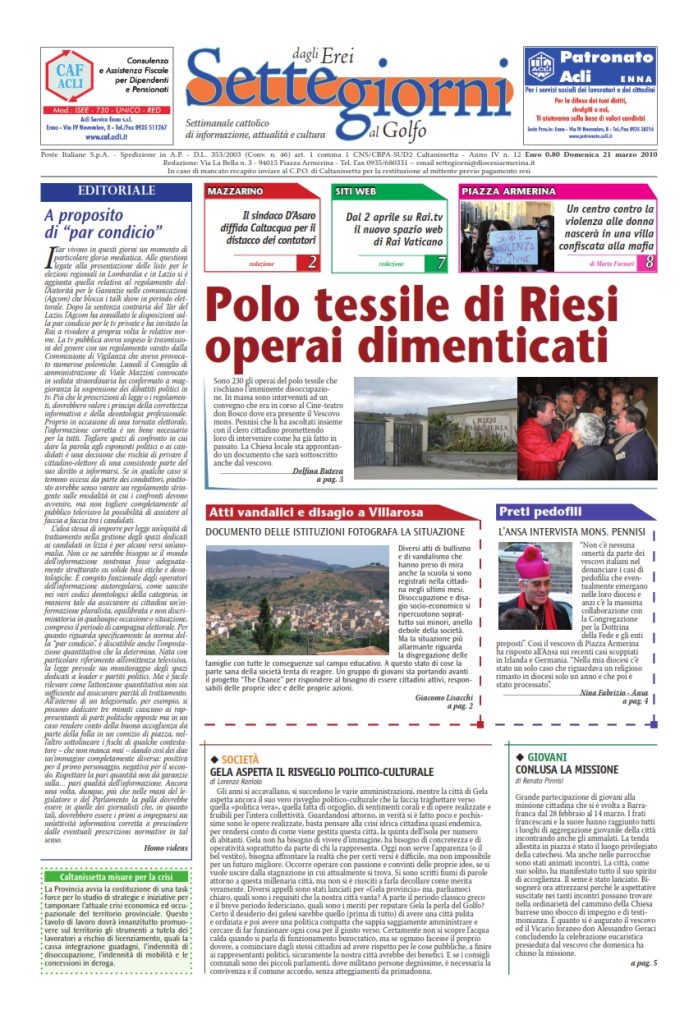 21 Marzo 2010 numeri del settimanale Settegiorni Settegiorni n. 12 del 21 marzo 2010 Clicca qui per leggere il numero in formato PDF CONDIVIDI SU