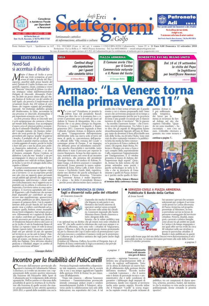 12 Settembre 2010 numeri del settimanale Settegiorni Settegiorni n. 30 del 12 settembre 2010 Clicca qui per leggere il numero in formato PDF CONDIVIDI SU