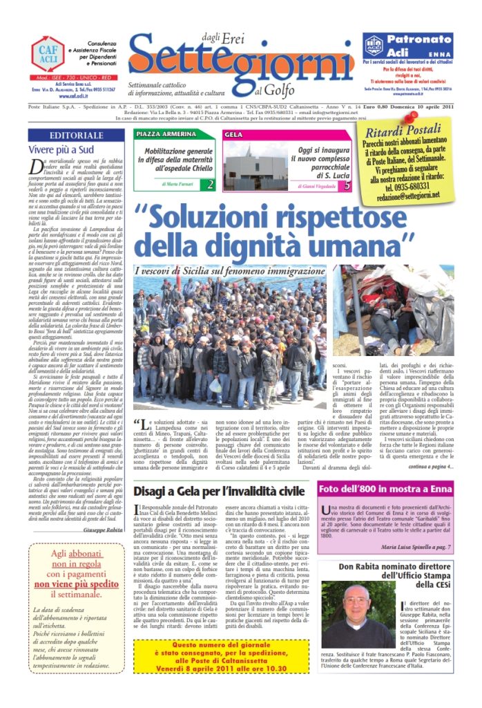 10 Aprile 2011 numeri del settimanale Settegiorni Settegiorni n. 14 del 10 aprile 2011 Clicca qui per leggere il numero in formato PDF CONDIVIDI SU