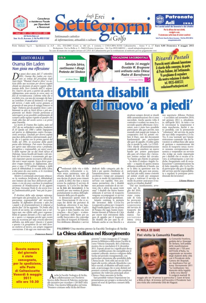 8 Maggio 2011 numeri del settimanale Settegiorni Settegiorni n. 17 dell’8 maggio 2011 Clicca qui per leggere il numero in formato PDF CONDIVIDI SU