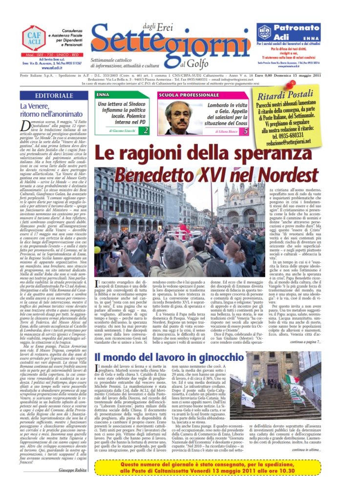 15 Maggio 2011 numeri del settimanale Settegiorni Settegiorni n. 18 del 15 maggio 2011 Clicca qui per leggere il numero in formato PDF CONDIVIDI SU