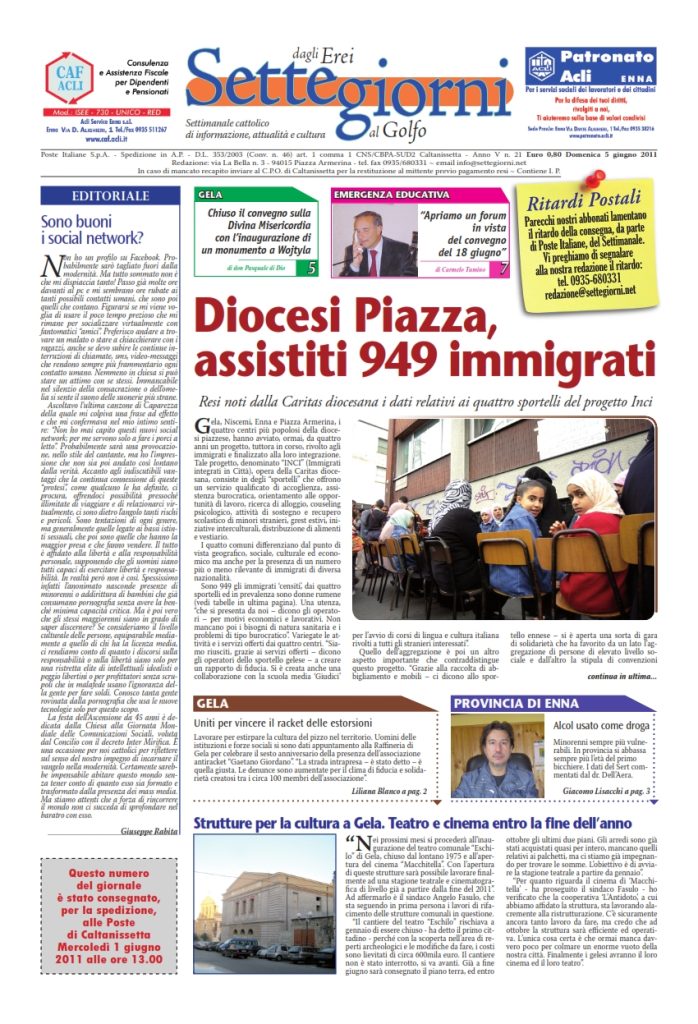 5 Giugno 2011 numeri del settimanale Settegiorni Settegiorni n. 21 del 5 giugno 2011 Clicca qui per leggere il numero in formato PDF CONDIVIDI SU