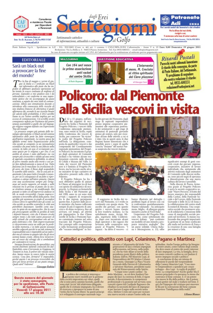 19 Giugno 2011 numeri del settimanale Settegiorni Settegiorni n. 23 del 19 giugno 2011 Clicca qui per leggere il numero in formato PDF CONDIVIDI SU