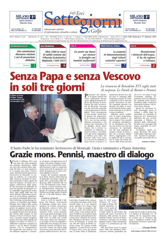 17 Febbraio 2013 numeri del settimanale Settegiorni Settegiorni n. 6 del 17 febbraio 2013 Clicca qui per leggere il numero in formato PDF CONDIVIDI SU