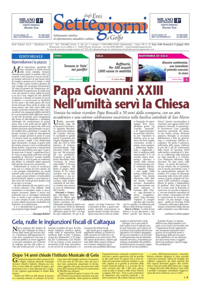 9 Giugno 2013 numeri del settimanale Settegiorni Settegiorni n. 21 del 9 giugno 2013 Clicca qui per leggere il numero in formato PDF CONDIVIDI SU