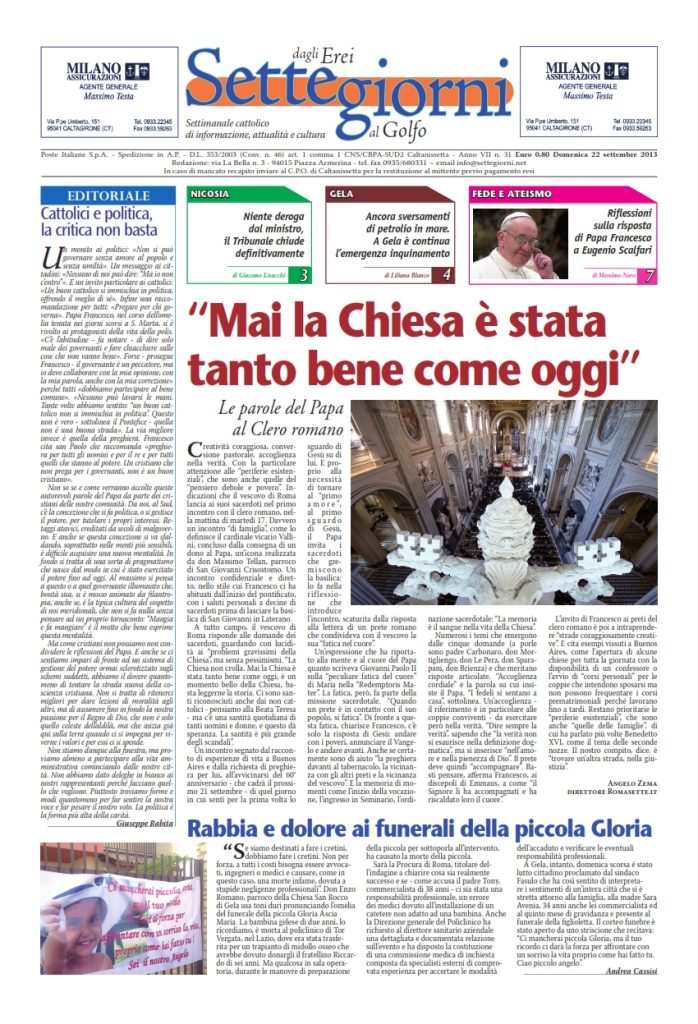22 Settembre 2013 numeri del settimanale Settegiorni Settegiorni n. 31 del 22 settembre 2013 Clicca qui per leggere il numero in formato PDF CONDIVIDI SU