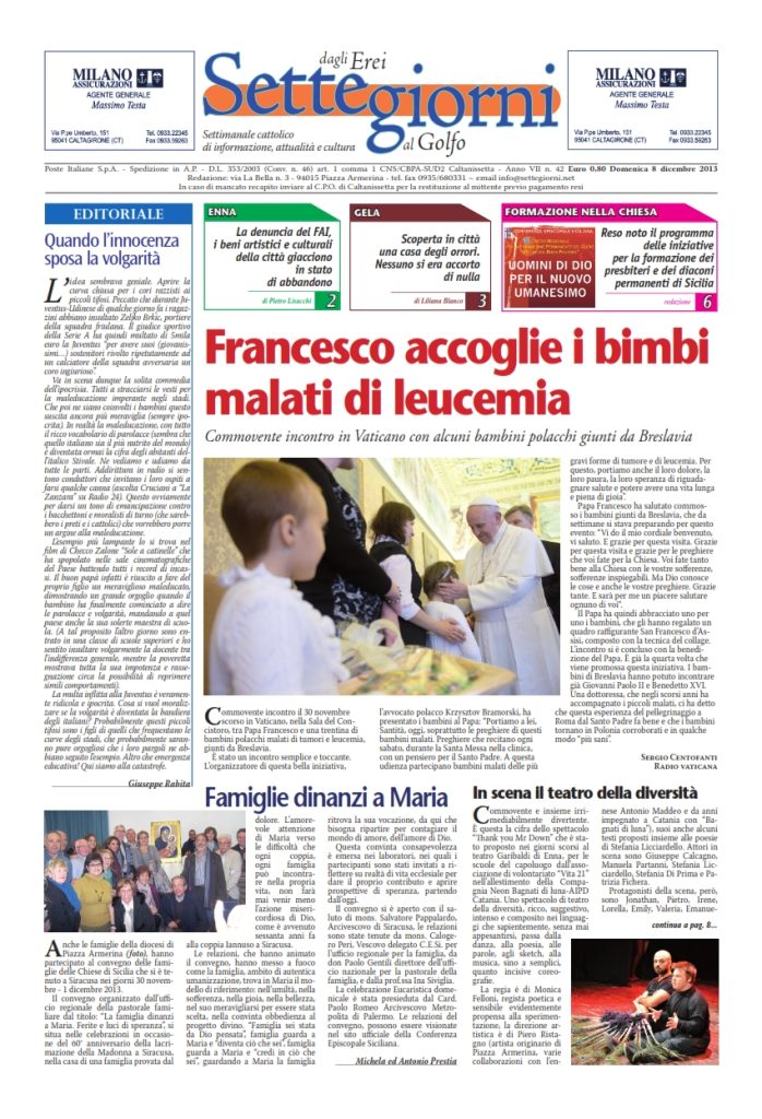 8 Dicembre 2013 numeri del settimanale Settegiorni Settegiorni n. 42 dell’8 dicembre 2013 Clicca qui per leggere il numero in formato PDF CONDIVIDI SU