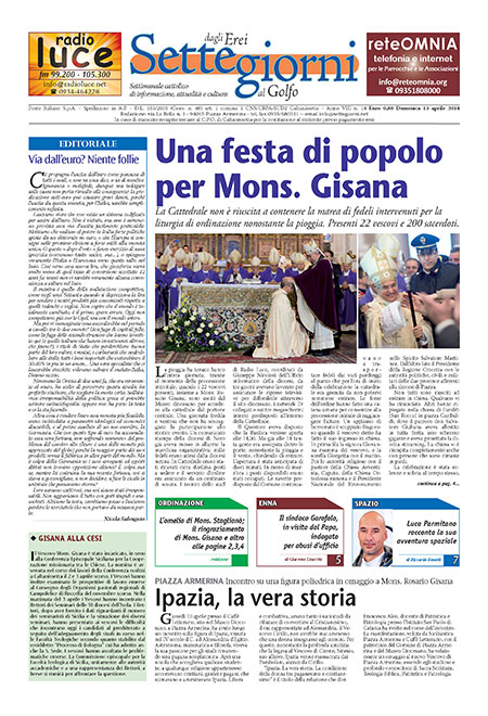 13 Aprile 2014 numeri del settimanale Settegiorni Settegiorni n. 14 del 13 aprile 2014 Clicca qui per leggere il numero in formato PDF CONDIVIDI SU