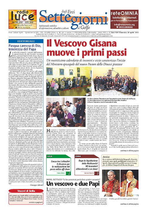 20 Aprile 2014 numeri del settimanale Settegiorni Settegiorni n. 15 del 20 aprile 2014 Clicca qui per leggere il numero in formato PDF CONDIVIDI SU