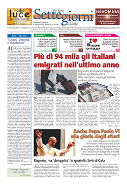 19 Ottobre 2014 numeri del settimanale Settegiorni Settegiorni n. 34 del 19 ottobre 2014 Clicca qui per leggere il numero in formato PDF CONDIVIDI SU