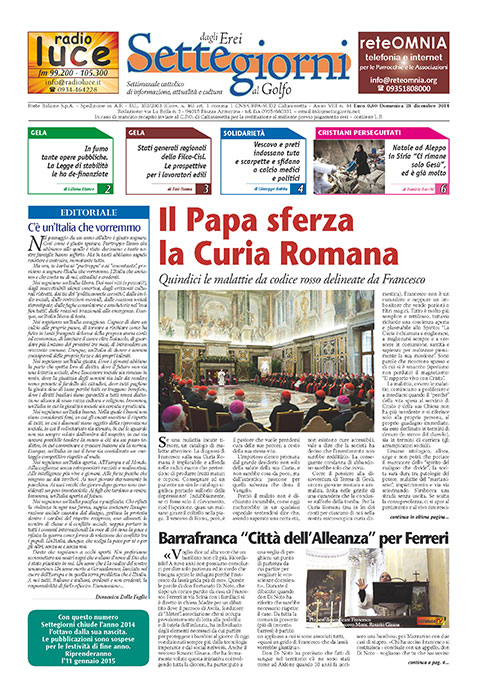 28 Dicembre 2014 numeri del settimanale Settegiorni Settegiorni n. 44 del 28 dicembre 2014 Clicca qui per leggere il numero in formato PDF CONDIVIDI SU