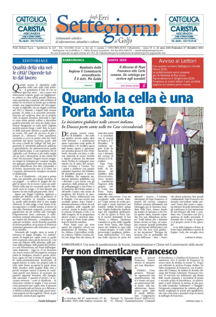 27 Dicembre 2015 numeri del settimanale Settegiorni Settegiorni n. 44 del 27 dicembre 2015 Clicca qui per leggere il numero in formato PDF CONDIVIDI SU