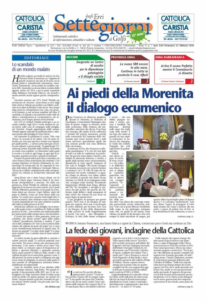 21 Febbraio 2016 numeri del settimanale Settegiorni Settegiorni n. 7 del 21 febbraio 2016 Clicca qui per leggere il numero in formato PDF CONDIVIDI SU