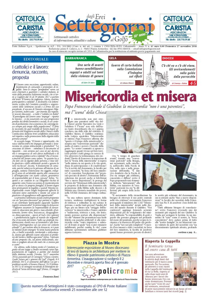 27 Novembre 2016 numeri del settimanale Settegiorni Settegiorni n. 40 del 27 novembre 2016 Clicca qui per leggere il numero in formato PDF CONDIVIDI SU