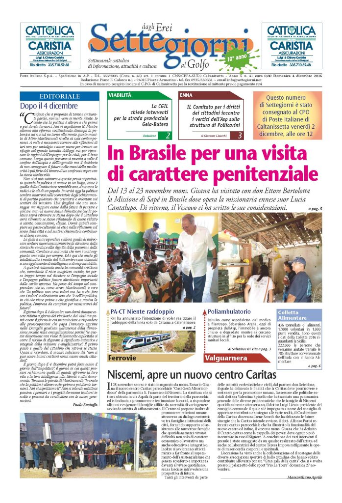 4 Dicembre 2016 numeri del settimanale Settegiorni Settegiorni n. 41 del 4 dicembre 2016 Clicca qui per leggere il numero in formato PDF CONDIVIDI SU