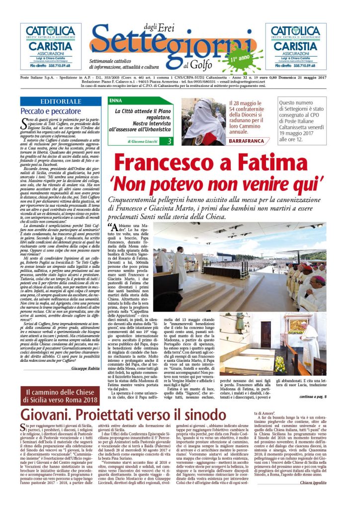 21 Maggio 2017 numeri del settimanale Settegiorni Settegiorni n. 19 del 21 maggio 2017 Clicca qui per leggere il numero in formato PDF CONDIVIDI SU