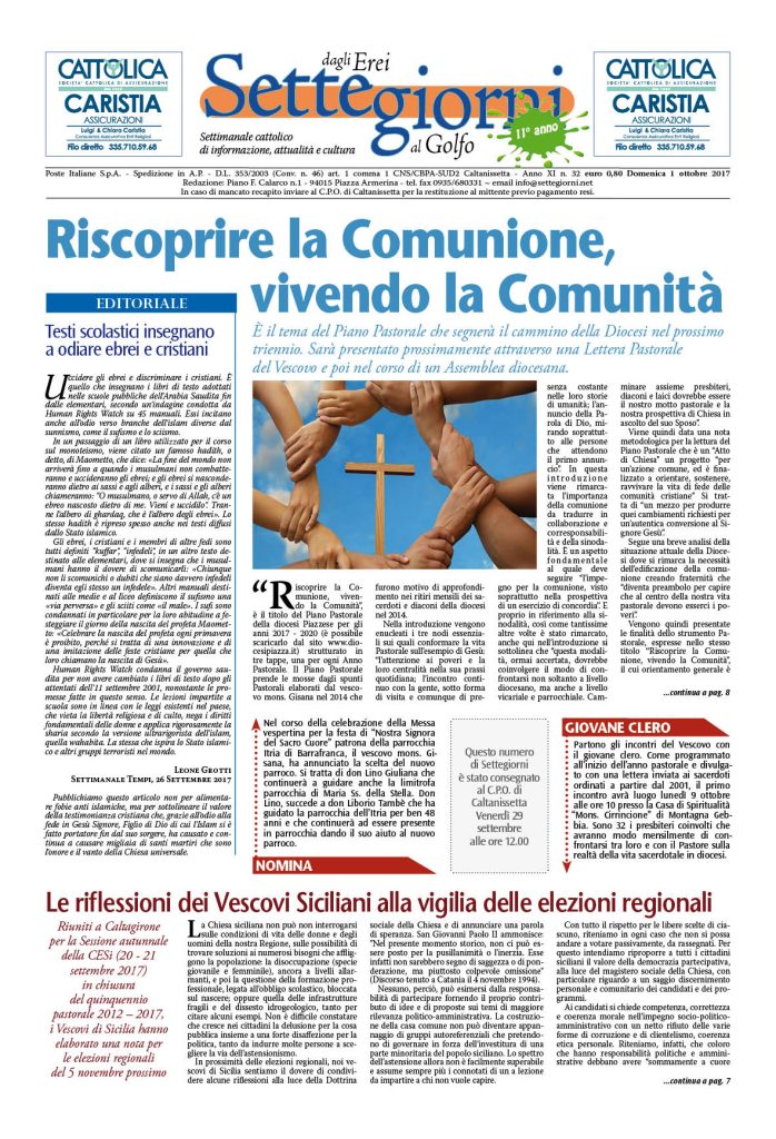 1 Ottobre 2017 numeri del settimanale Settegiorni Settegiorni n. 32 dell’1 ottobre 2017 Clicca qui per leggere il numero in formato PDF CONDIVIDI SU