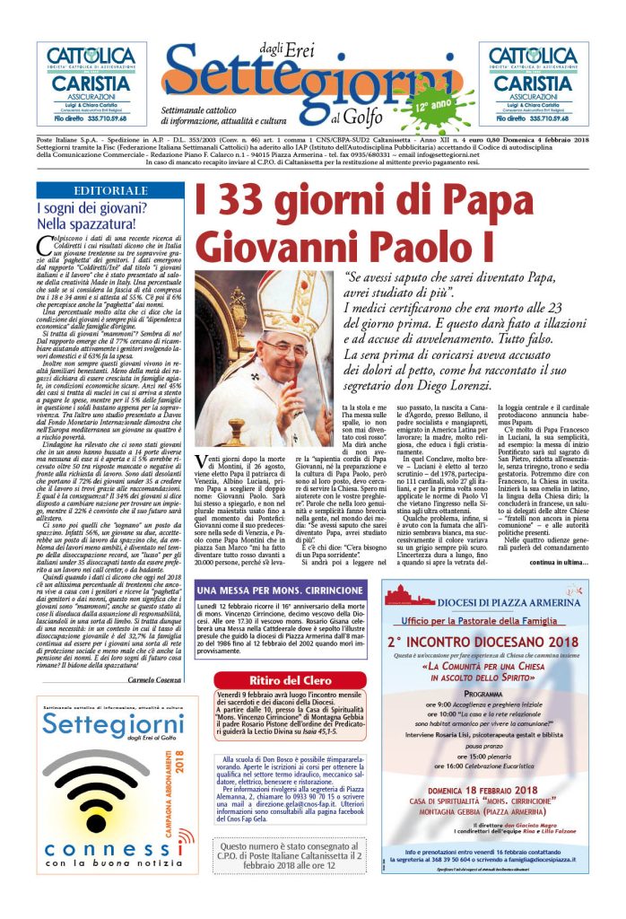 4 Febbraio 2018 numeri del settimanale Settegiorni Settegiorni n. 4 del 4 febbraio 2018 Clicca qui per leggere il numero in formato PDF CONDIVIDI SU