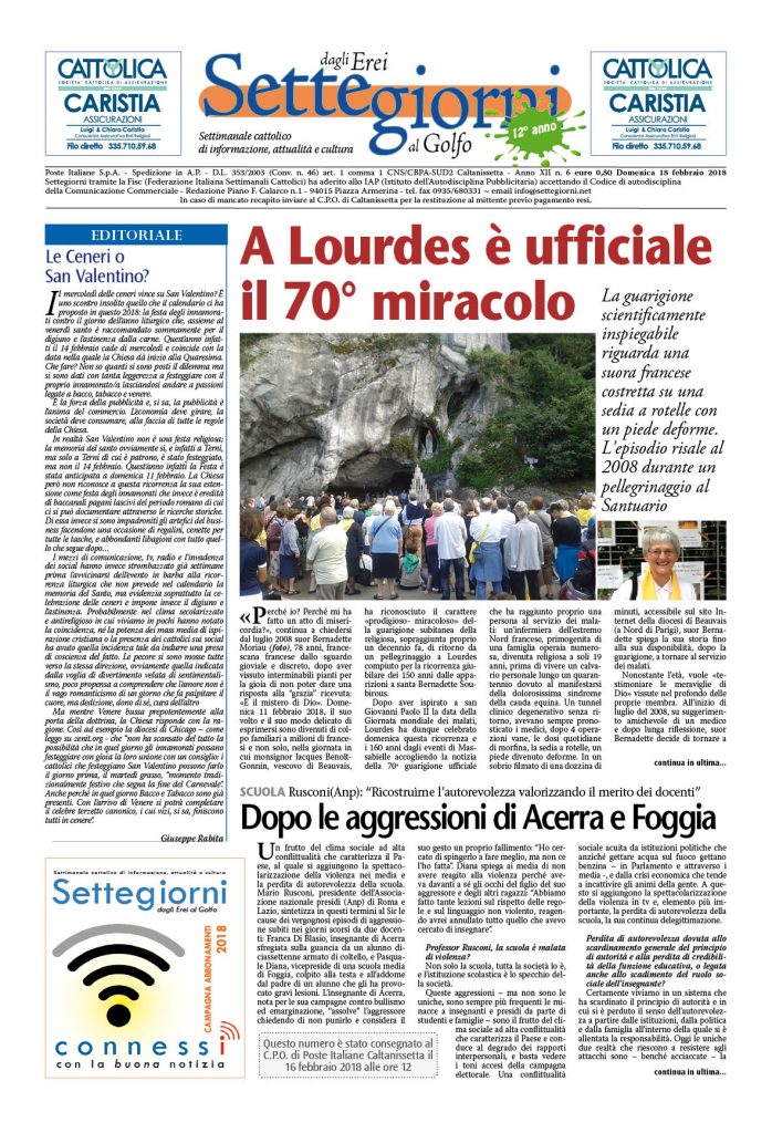 18 Febbraio 2018 numeri del settimanale Settegiorni Settegiorni n. 6 del 18 febbraio 2018 Clicca qui per leggere il numero in formato PDF CONDIVIDI SU