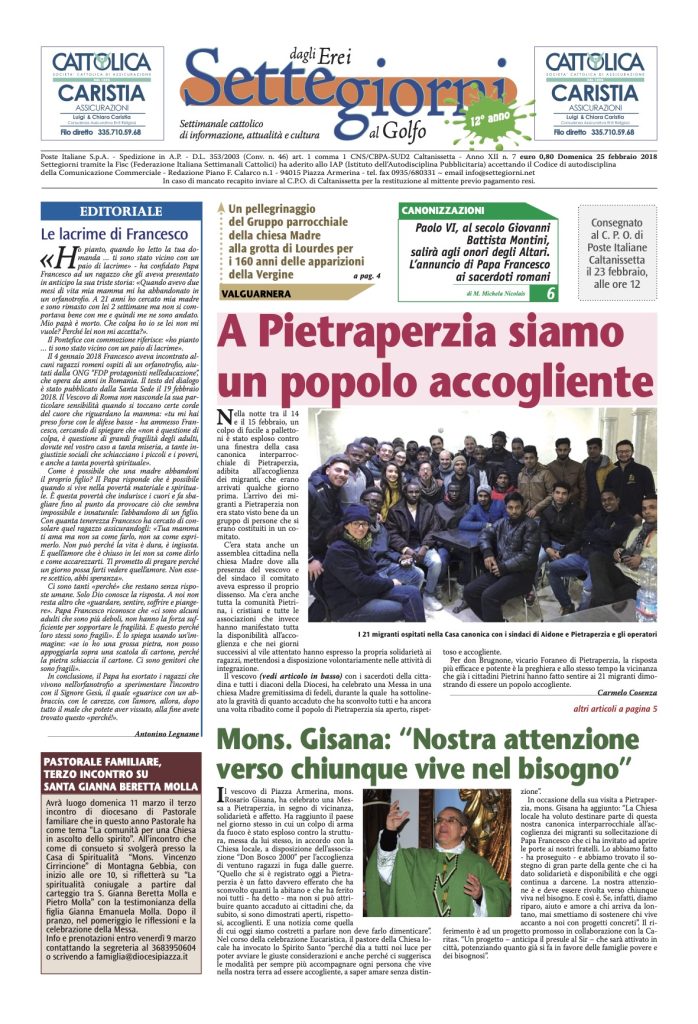 25 Febbraio 2018 numeri del settimanale Settegiorni Settegiorni n. 7 del 25 febbraio 2018 Clicca qui per leggere il numero in formato PDF CONDIVIDI SU