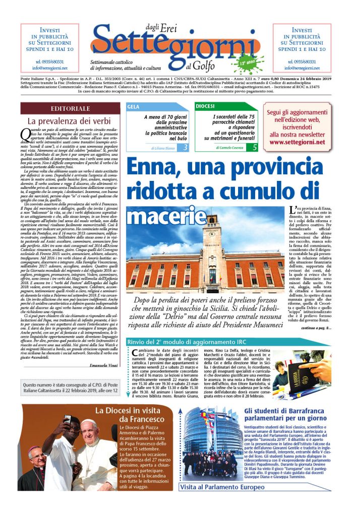24 Febbraio 2019 numeri del settimanale Settegiorni Settegiorni n. 7 del 24 febbraio 2019 Clicca qui per leggere il numero in formato PDF CONDIVIDI SU