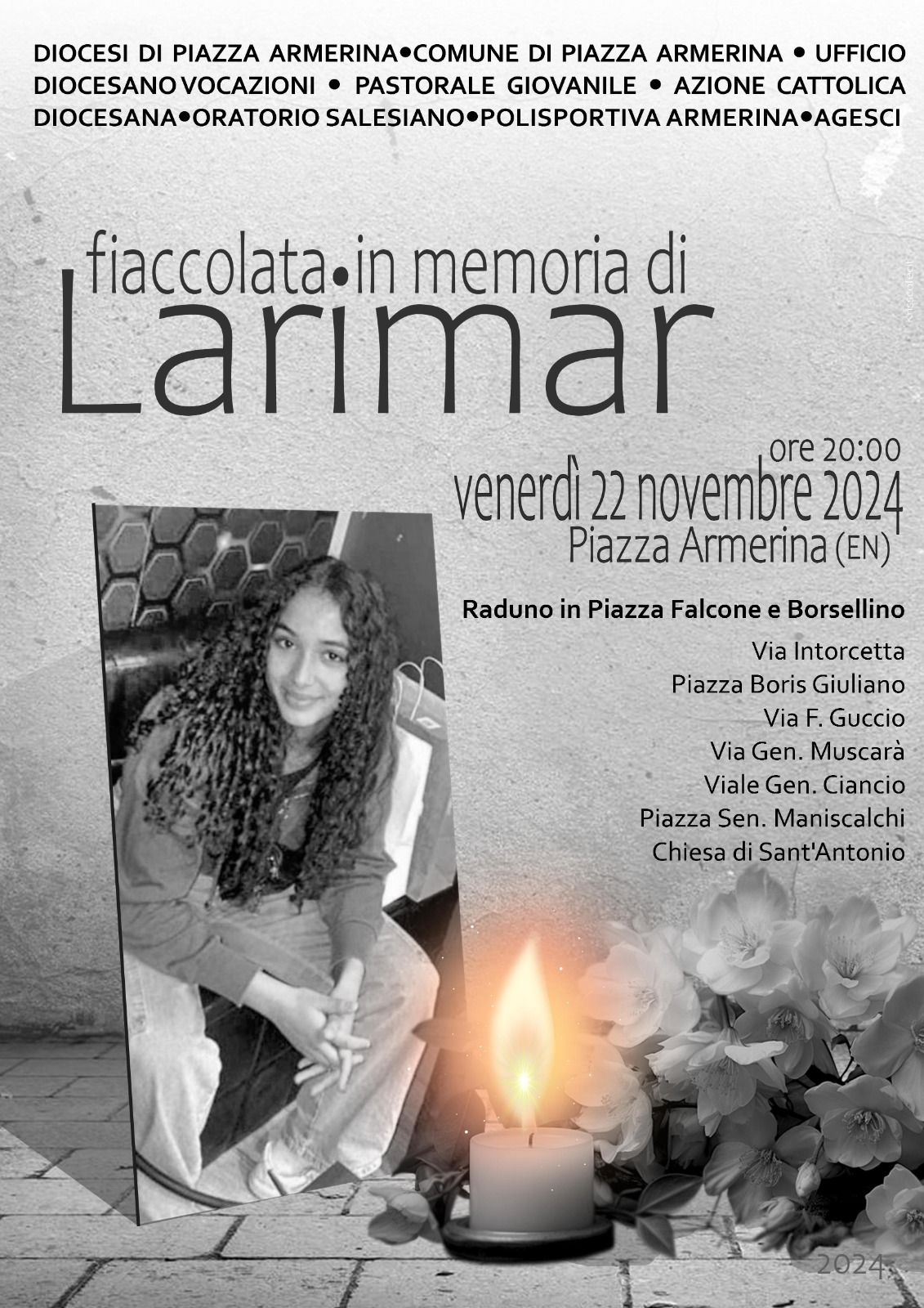 Si terrà venerdì 22 novembre alle ore 20 la Fiaccolata in memoria di Larimar. L’iniziativa è organizzata dell’équipe di pastorale giovanile diocesana, in collaborazione con il comune di Piazza Armerina e la Polisportiva Armerina dove la giovane studentessa giocava a pallavolo.
