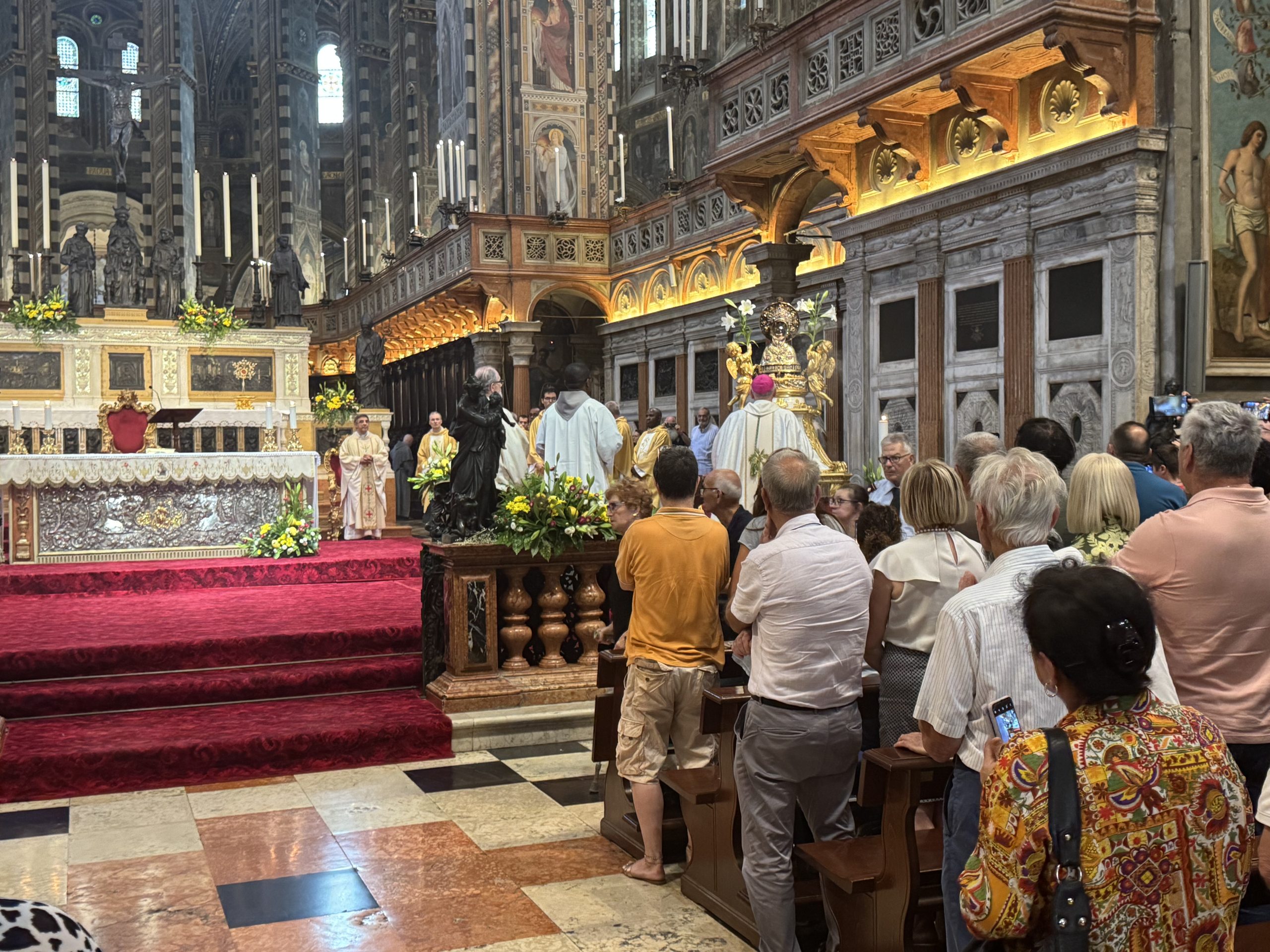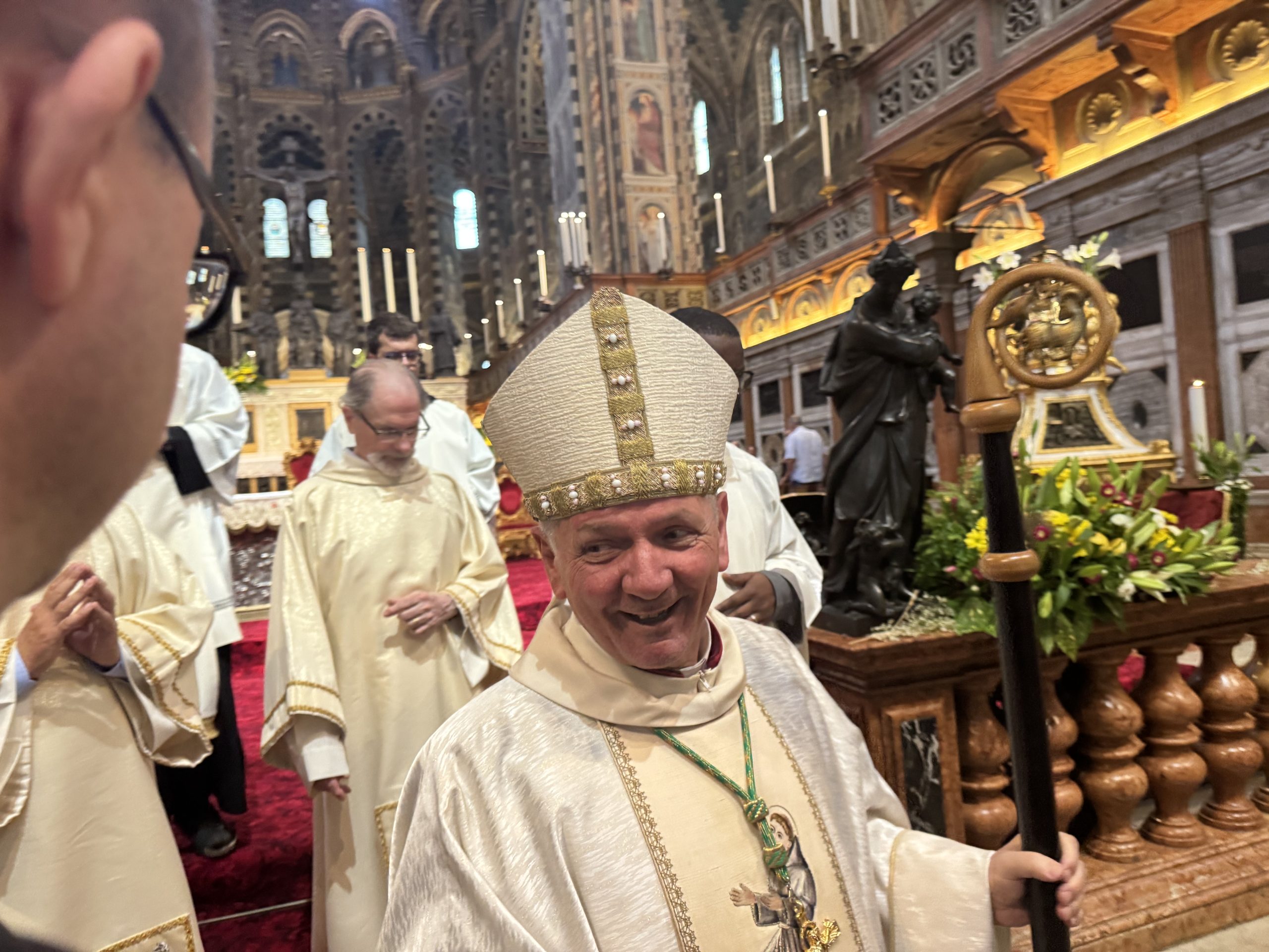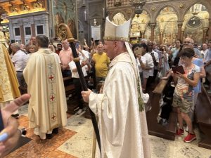 Solenne messa pontificale celebrata a Padova nella Basilica di Sant’Antonio in occasione della festa del Santo, venerdì 13 giugno. Il rito sacro è stato presieduto dall’ordinario diocesano , S.E. monsignor Claudio Cipolla. Con lui hanno concelebrato tutti i sacerdoti della diocesi di Padova. La figura di Sant’Antonio è in perfetta sintonia con il tema del Giubileo, ovvero la Speranza, poiché il taumaturgo, nativo di Lisbona è uomo di speranza. E tutti i pellegrini a Padova, sono pellegrini di speranza nel ricordo e nel segno di Papa Francesco e obbedienti a Papa Leone. Il vescovo ha sottolineato come sia una richiesta d’aiuto e di soccorso questo continuo peregrinare presso la tomba del Santo, al quale sono devoti tutti i popoli della terra. Un popolo, quello dei devoti, che non si vergogna di dirsi fiducioso in Dio. “Siamo creature bisognose di sentirsi amate; non ci vergogniamo di ricorrere umilmente a Sant’ Antonio per chiedere la sua intercessione, le nostre orazioni e implorazioni contengono sentimenti di speranza, che si concretizzano nelle tre virtù teologali, fede speranza e carità”. La condizione di fede è la domanda a Dio di un miracolo, ovvero la forza di vivere. E da qui scaturisce la speranza di un domani migliore nel nome di Gesù al quale ci ritroveremo accanto per intercessione di Sant’Antonio. “Se miracoli desiderate ricorrete a Sant’Antonio… Lo dicano i padovani… Il miracolo è vedere con gli occhi di Dio”. Il presule ha evidenziato come i credenti debbano sempre accogliere sulle loro spalle le grandi sofferenze dei loro cari ma anche le grandi sofferenze di tutto il mondo, quali ogni guerra, ogni povertà, ogni privazione di libertà. E questa è Carità. Bisogna porre condizioni più umane e cammini di umanizzazione in Terra Santa e in Ucraina come in tutte le parti tutto il del mondo. “Andate in tutto il mondo e predicate il Vangelo ad ogni creatura e Antonio ci precede e apre il cammino di speranza”, ha concluso monsignor Cipolla.