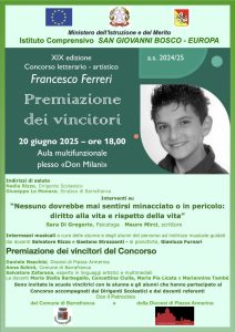 Si è svolta lo scorso 20 giugno presso l’aula multifunzionale del pesso “Don Milani” dell’I. C. “San Giovanni Bosco – Europa” di Barrafranca la cerimonia di premiazione dei vincitori del concorso letterario-artistico “Francesco Ferreri”, giunto alla sua 19^ edizione. All’Istituto Comprensivo “San Giovanni Bosco – Europa”, promotore del bando di concorso con il patrocinio del Comune di Barrafranca e della Diocesi di Piazza Armerina, sono pervenuti più di 200 lavori realizzati da alunne e alunni delle quarte e quinte classi della scuola primaria e di tutte le classi delle scuole secondarie di I e II grado di scuole del I e del II ciclo di tutto il territorio nazionale.