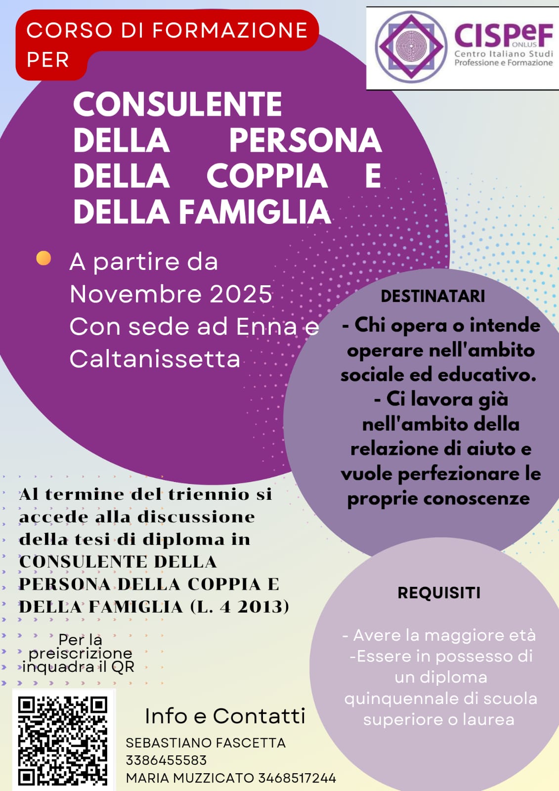 Considerata la crescente necessità di coppie, ma anche singole persone, di trovare spazi accoglienti di ascolto per riceve aiuto, sostegno nel percorso di attraversamento e superamento di situazioni relazionali e personali di disagio, desideriamo proporre al nostro territorio ennese, un Corso di formazione per Consulente della Persona, della Coppia e della Famiglia, quale professione regolamentata dalla L.4/2013, che avrà inizia a Novembre 2025.