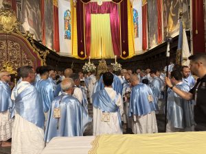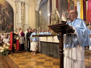 Ci siamo, il tempo è giunto. Maria è in mezzo al suo popolo. Domenica sera, la cerimonia di apertura del simulacro di Maria Santissima della Visitazione, e la conseguente traslazione dalla Cappella dei Marmi all’Altare Centrale dove è stata intronizzata. Protagonisti gli “Ignudi”, ovvero i confrati di Maria Santissima della Visitazione, guidati dal rettore Mimmo Valvo e dall’assistente spirituale p. Enzo Murgano. Presente una delegazione dell’Amministrazione comunale, guidata dal vice sindaco Francesco Comito. Presenti, inoltre, il presidente del Collegio dei rettori delle confraternite, Giovani Zodda, nonché il coordinatore diocesano Gaetano Di Venti. In un duomo, come sempre gremito, Murgano ha detto: “Qui è presente Enna, e un particolare saluto rivolgo a tutte quelle persone che non possono essere qui, perché malate o impedite”. Murgano, ha inoltre posto in evidenza come ciascuno dei presenti, fissi lo sguardo su Maria, mentre Lei, la Madre di Dio, fa lo stesso su ognuno. E quegli sguardi che fissano la Santa Madre, sono espressioni di gratitudine, di invocazione, ma anche di angoscia e richiesta di grazia per momenti particolari che si attraversano. Tutti quanti, posando e fissando lo sguardo sul viso di Maria, esprimono tali sentimenti. Lei, contraccambia quegli sguardi, rivolgendo loro “gli occhi suoi misericordiosi” e intercedendo presso il suo Figlio, ancora una volta, come quel giorno, a Cana di Galilea, quando gli dice: “Non hanno più vino” e, contemporaneamente, ripete ancora una volta il: “Fate quello che lui vi dirà”. È seguita la messa presieduta da p. Salvatore Rindone, che ha imperniato la predica sull’unità della Chiesa comparando l’antiteticitá dei pagani che festeggiavano a Roma i due fondatori della città, Romolo e Remo, con i due grandi fondatori della Chiesa , Pietro e Paolo. Romolo uccide Remo in seguito a un diverbio. Nella Chiesa , Pietro e Paolo sono profondamente diversi, eppure l’amore di Cristo li unisce. La Chiesa Cattolica è quindi capace di tenere insieme gli opposti. Cristo non è divisivo e per mezzo di Maria, fa santo anche il più grande fra i peccatori.