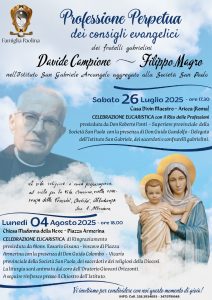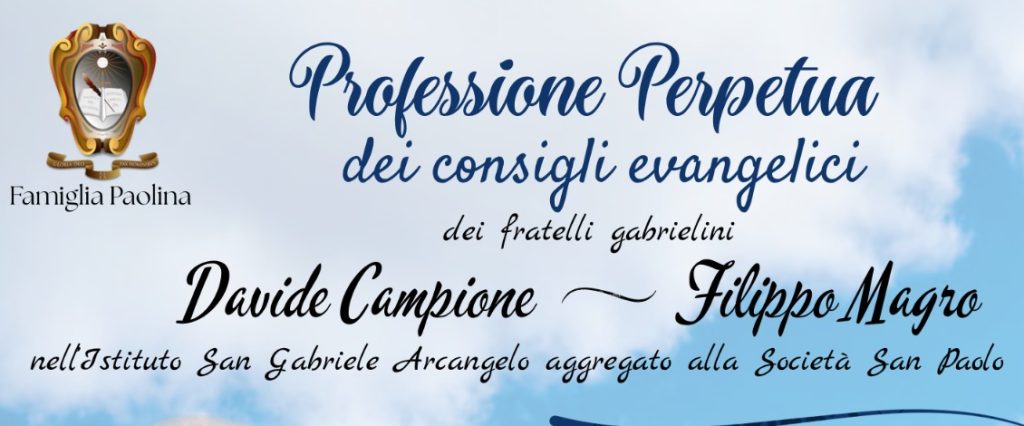 Il prossimo 26 luglio presso la Casa del Divin Maestro di Ariccia a Roma nella memoria mensile del  beato Giacomo Alberione, fondatore della famiglia paolina, i fratelli gabrielini Davide Campione e Filippo Magro dell’ Istituto San Gabriele Arcangelo, emetteranno la loro professione perpetua pronunciando davanti al Superiore Provinciale della Società San Paolo, al Delegato dell’Istituto San Gabriele e alla comunità dei sacerdoti paolini e dei confratelli presenti, il loro «sì, per sempre» a Dio.