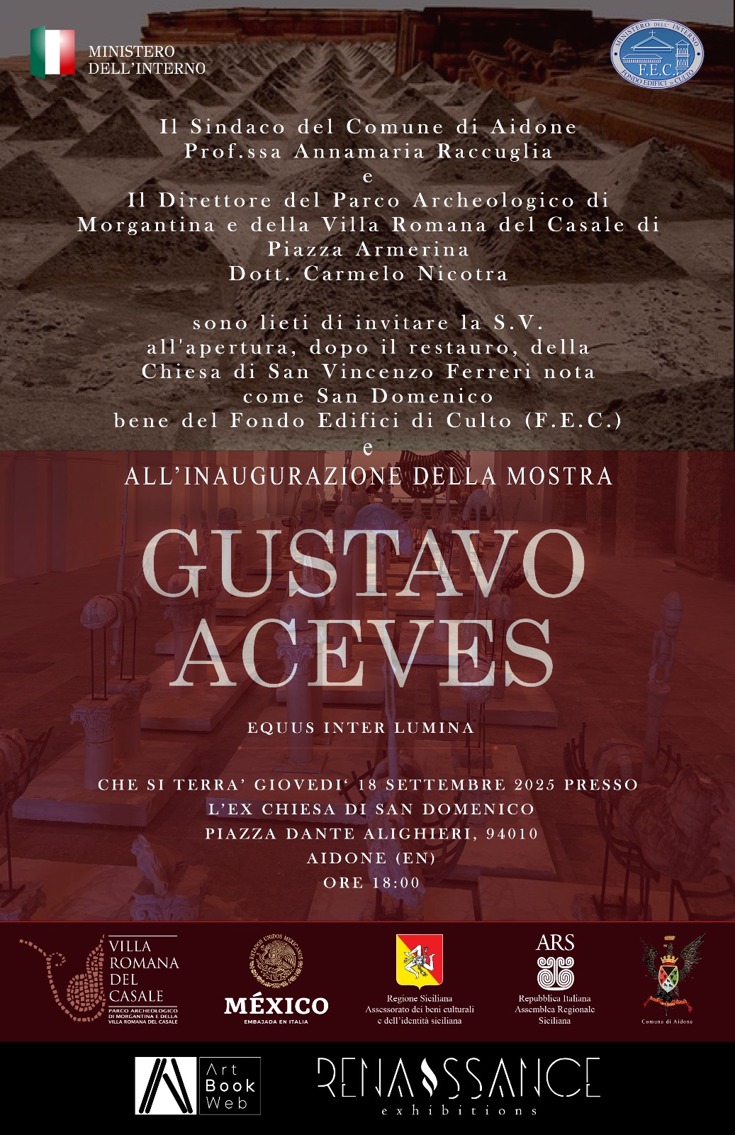 Ad accogliere i visitatori sarà la mostra Equus Inter Lumina di Gustavo Aceves, un progetto diffuso che prende avvio dal Parco Archeologico di Morgantina e della Villa Romana del Casale, diretto dal dott. Carmelo Nicotra, e si sviluppa nei comuni di Piazza Armerina, Aidone, Mazzarino e Pietraperzia. L’iniziativa rientra nella programmazione culturale del Parco e del suo Comitato Tecnico Scientifico, presieduto dal Soprintendente Angelo di Franco.