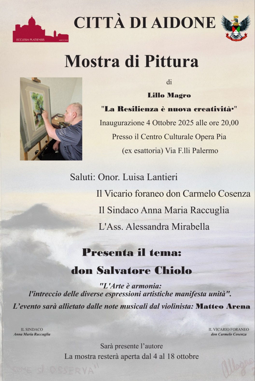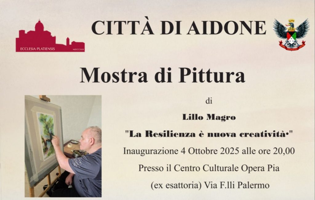 L’arte, e in particolare la pittura, è da sempre un mezzo per esplorare e comunicare la resilienza, ovvero la capacità di affrontare e superare le avversità, e può essere vista come una forma di nuova creatività, specialmente in contesti contemporanei. Ad Aidone, presso il Centro culturale Opera Pia (ex Esattoria) è prevista perle ore 20 di sabato 4 ottobre l’inaugurazione della Mostra di Pittura “La Resilienza è nuova creatività” di Lillo Magro, organizzata dalla docente Anna Maria Raccuglia, Sindaco del Comune di Aidone, e da don Carmelo Cosenza, Vicario foraneo di Aidone. Ad omaggiare il significato alla personale del Magro don Salvatore Chiolo che illustrerà le tematiche coniugando resilienza e nuova creatività, nella certezza e consapevolezza che l’arte può essere uno strumento utile per sviluppare resilienza; con interventi programmati del deputato regionale Luisa Lantieri, di don Carmelo Cosenza, del Sindaco Annamaria Raccuglia e dell’Assessore cittadino alla Cultura Alessandra Mirabella.