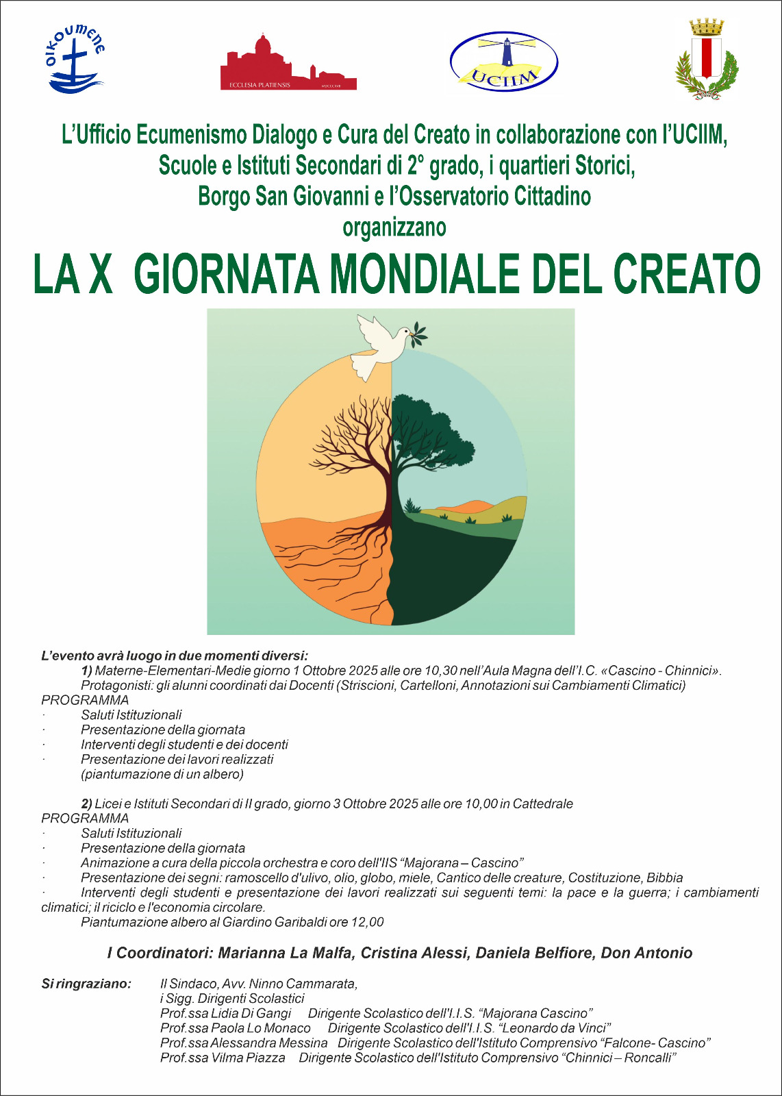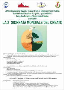 Torna anche quest’anno la celebrazione a livello diocesano della Giornata mondiale per la custodia del creato (celebrata l’1 settembre) che l’Ufficio diocesano per l’Ecumenismo, il Dialogo e la Cura del Creato, diretto da mons. Antonino Scarcione in collaborazione con l’Uciim e le Scuole di ogni Ordine e grado, celebra tra la fine di settembre e l’inizio di ottobre per coinvolgere gli studenti delle scuole di ogni ordine e grado. Quest’anno la giornata ha assunto un significato particolare poichè è il decimo anniversario dell’Enciclica di Papa Francesco “Laudato si’.