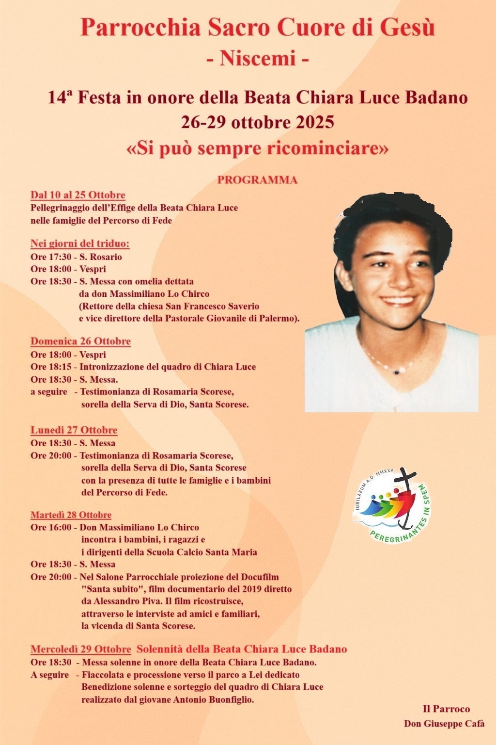 Da allora, ogni anno si celebra in suo onore la festa, giunta quest’anno alla sua 14^ edizione che, prende spunto dalla frase della Beata Chiara Luce: “Bisogna ricominciare sempre”, ci siamo interrogati e chiesti: “Come si fa a ricominciare sempre”? La festa si svolgerà con un triduo di celebrazioni predicato da don Massimiliano Lo Chirco, sacerdote di Palermo, rettore della chiesa di san Francesco Saverio e vice direttore della Pastorale Giovanile della Diocesi di Palermo, dal 26 al 29 ottobre, giorno indicato dalla chiesa alla memoria liturgica dedicata alla Beata;