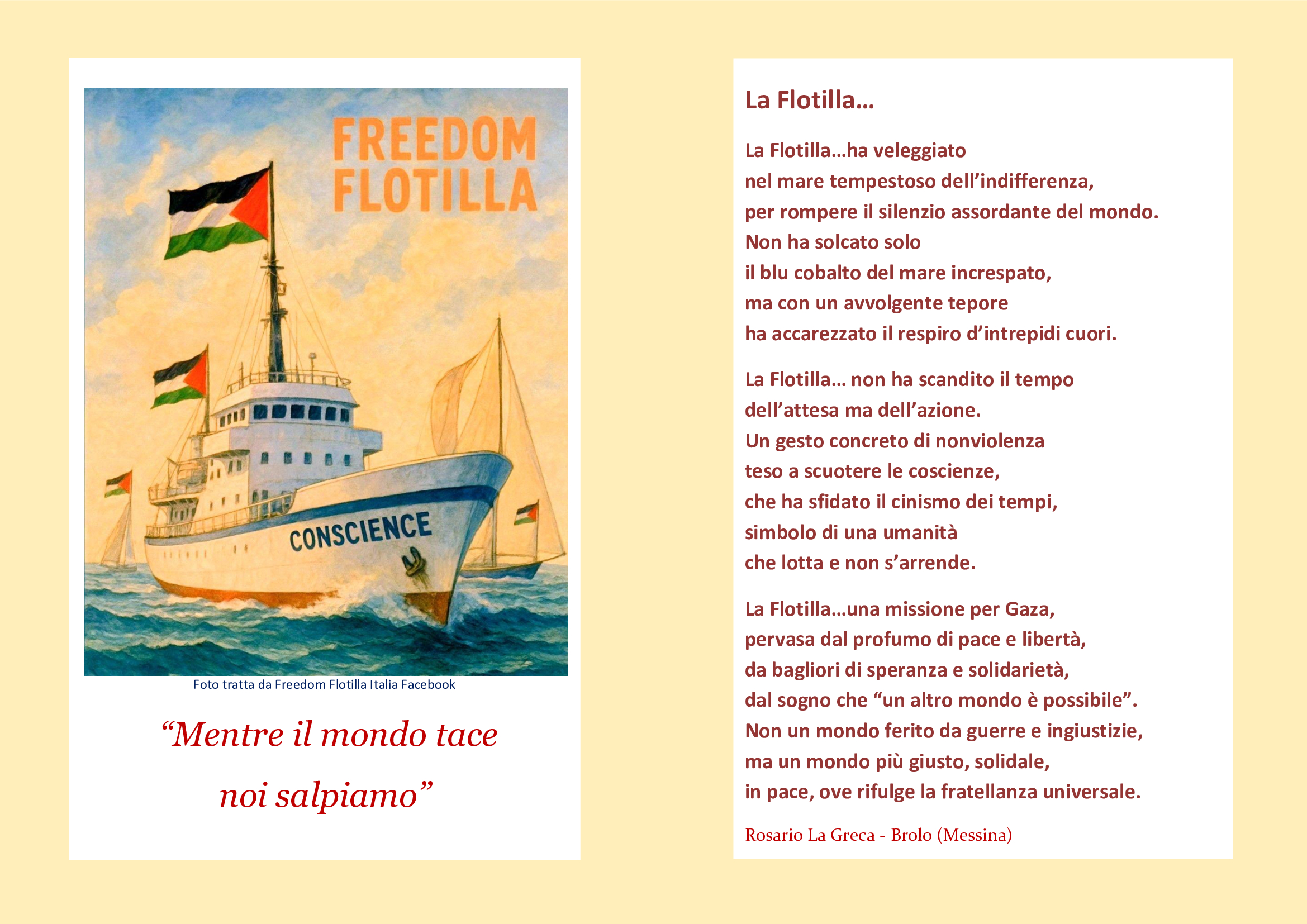 Il poeta di Brolo, Rosario La Greca ha composto la poesia “La Flotilla” come omaggio all’iniziativa Global Sumud Flotilla,  la più ampia missione navale non violenta, mai tentata a sostegno dei palestinesi, coordinata da una rete globale di movimenti e associazioni.