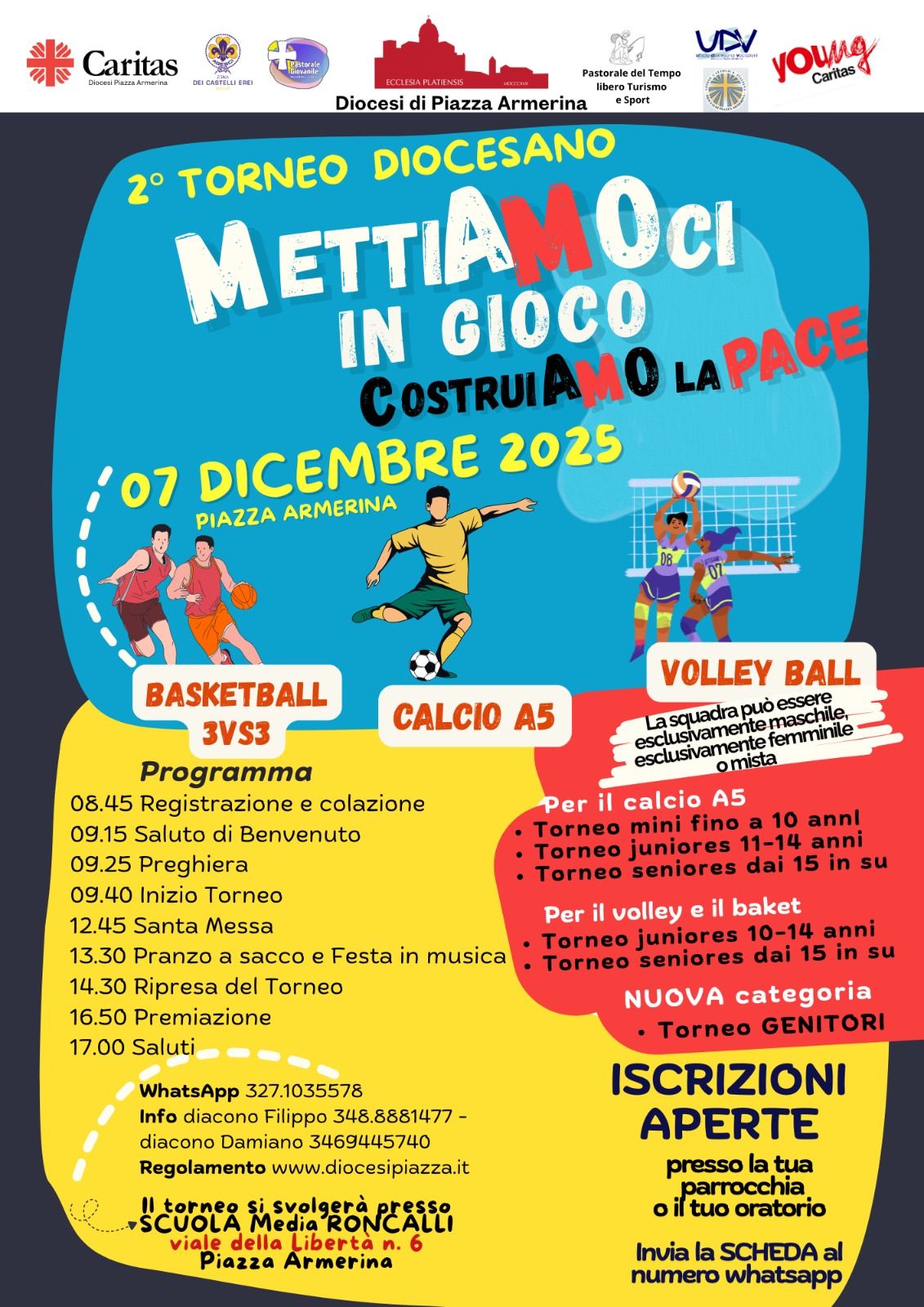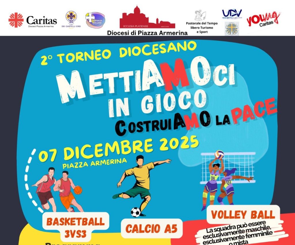 Si terrà domenica 7 dicembre dalle ore 08.45 a Piazza Armerina la seconda edizione del torneo sportivo diocesano dal tema “MettiAMOci in gioco. CostruiAMO la pace”. Il torneo sportivo, come la scorsa edizione, è concepito come momento di condivisione, aggregazione e divertimento tra i giovani delle aggregazioni laicali e delle parrocchie della Diocesi.