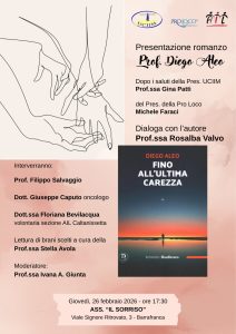 Preso l’associazione “Il sorriso” in viale Signore ritrovato 3, a Barrafranca, giovedì 26 febbraio alle ore 17.30 verrà presentato il romanzo del prof. Diego Aleo “Fino all’ultima carezza”. L’evento è organizzato