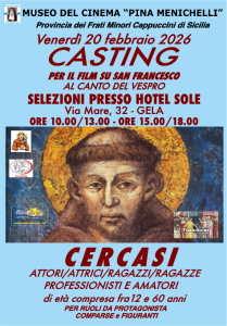 Venerdì 20 febbraio dalle 10 alle 18 si terrà a Gela presso l’hotel Sole un casting alla ricerca di attori e comparse per il mediometraggio su San Francesco d’Assisi “Al canto del Vespro”. Il progetto è inquadrato fra gli eventi in programma per l’VIII Centenario della morte del Poverello d’Assisi.